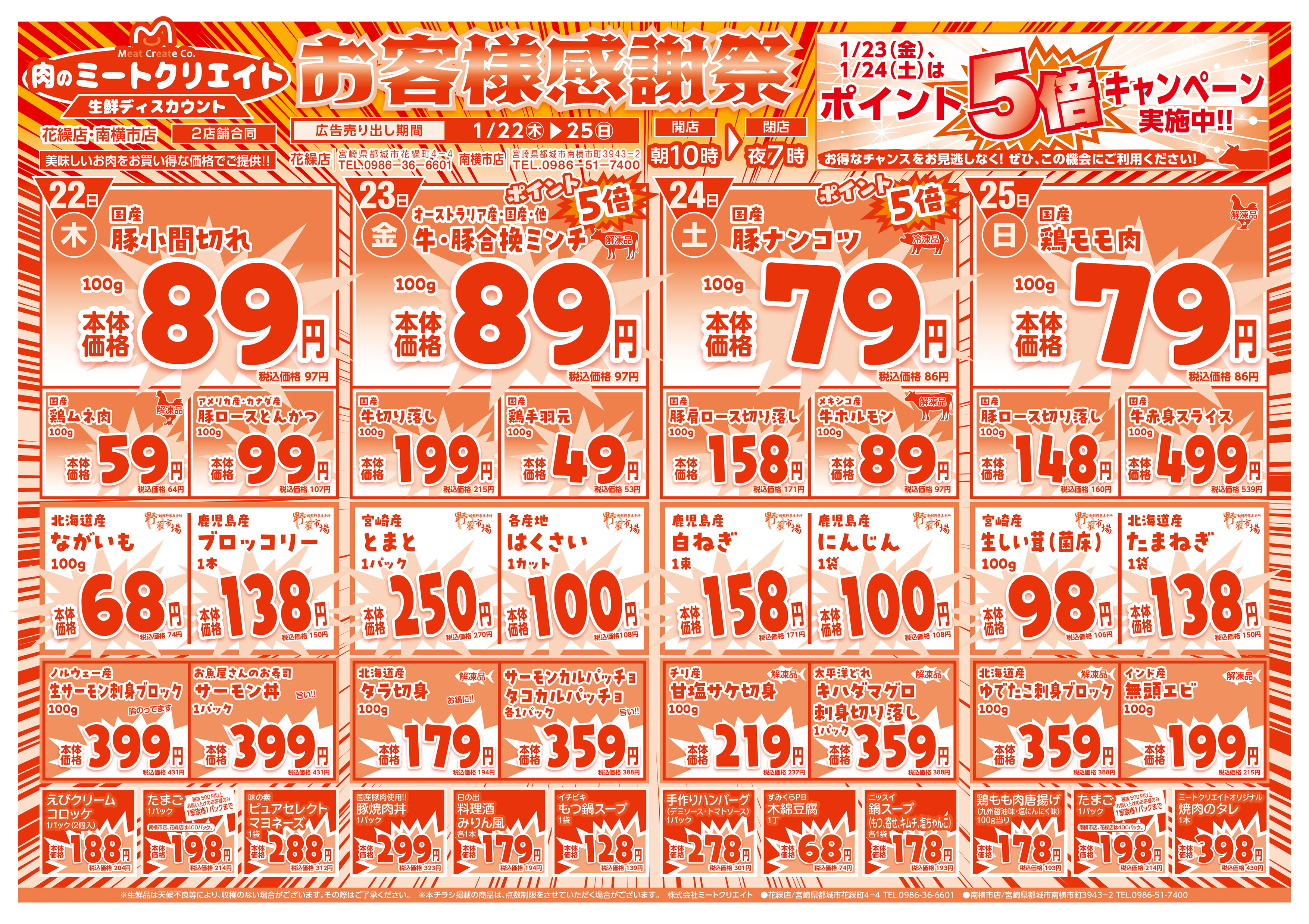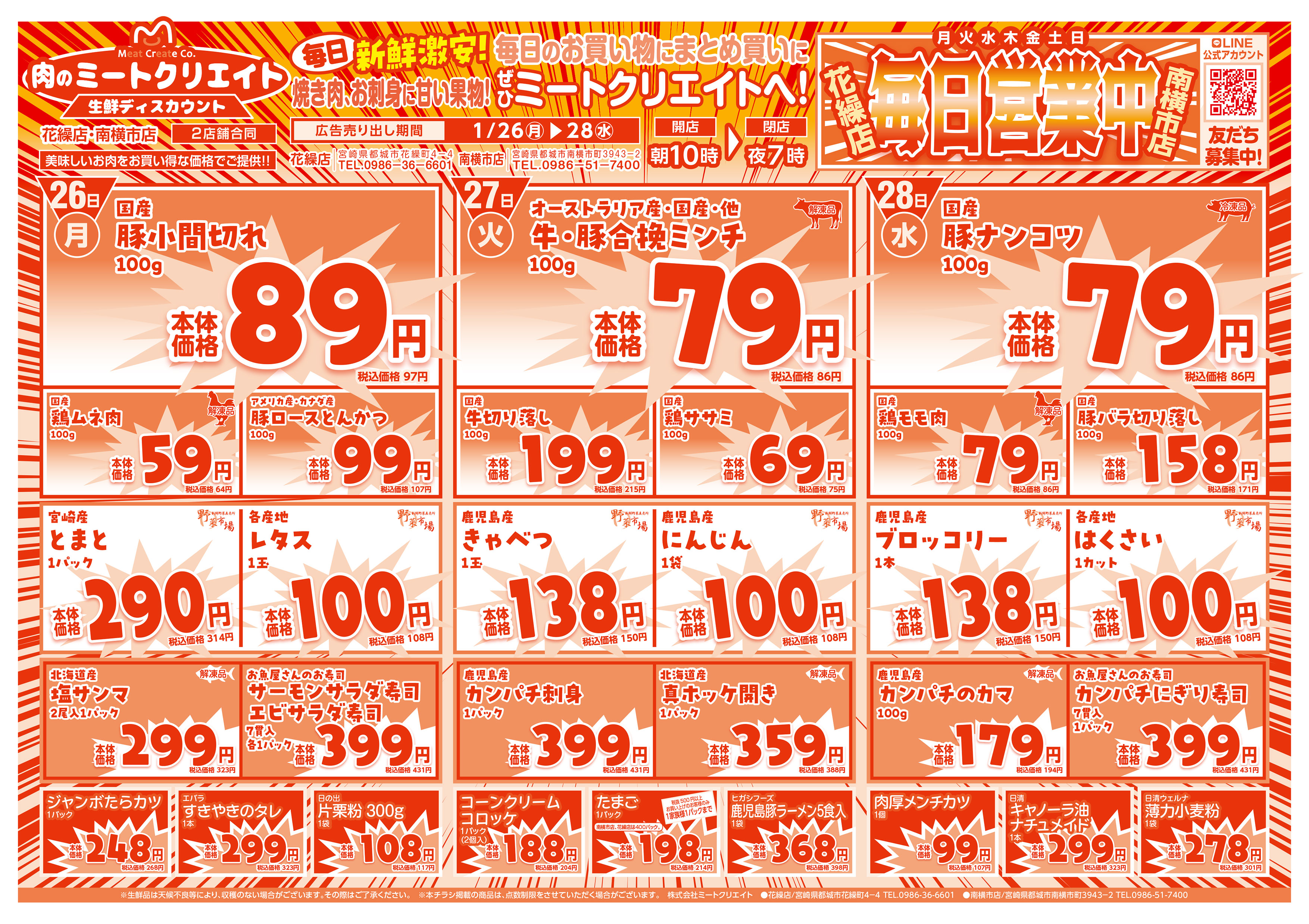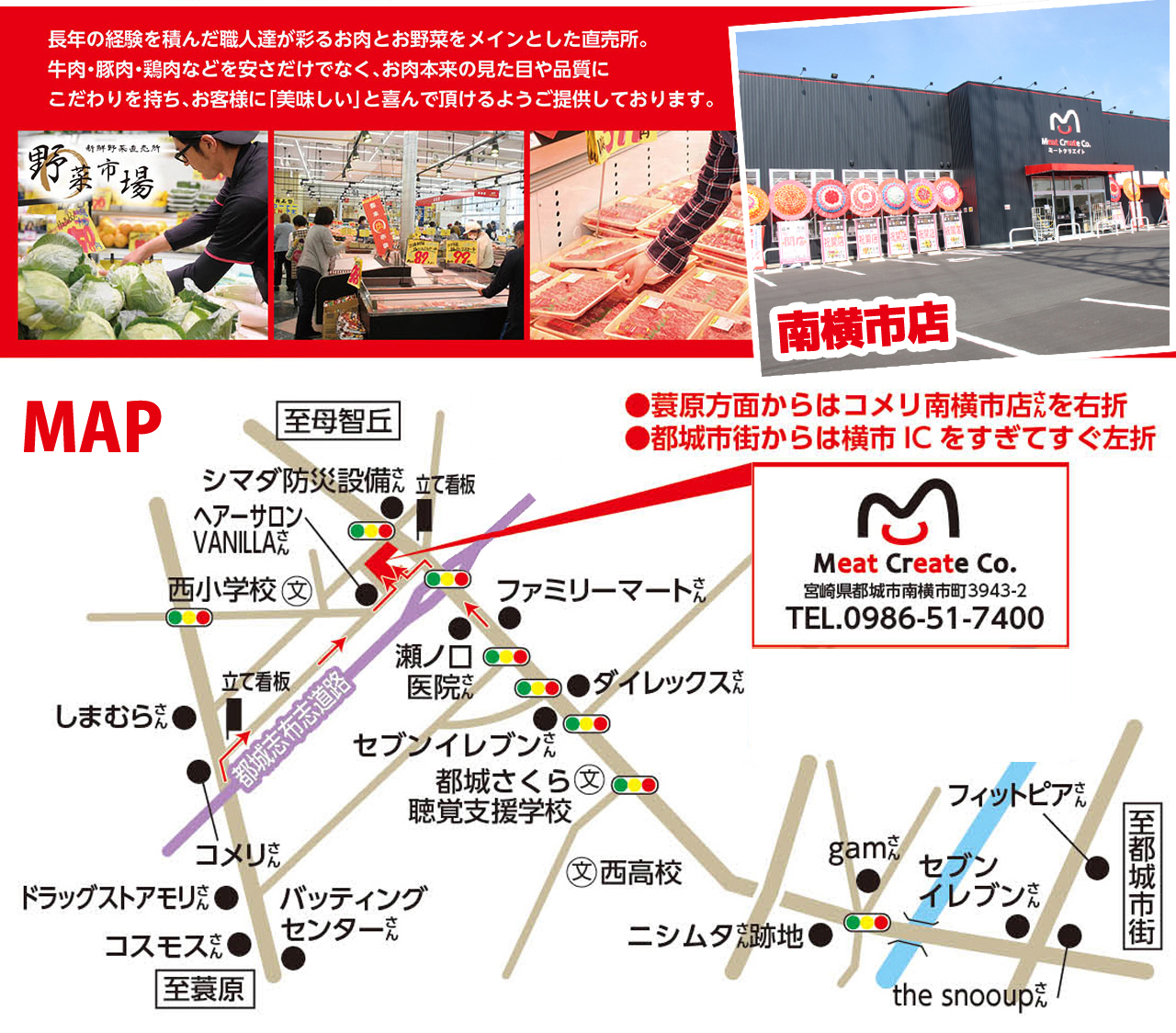 都城市花繰町・南横市町にある「肉のミートクリエイト」さんは 新鮮なお肉はもちろん、手づくりのお惣菜やお弁当、野菜や果物など幅広い品揃えのお店です♪2026年1月12日より毎日営業しております!鮮魚コーナーの「マリンクリエイト」では新鮮な魚介類を豊富なラインナップでご用意しております☆